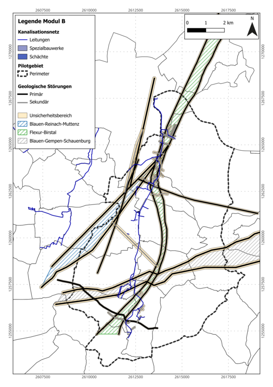 Die Region Basel weist aufgrund ihrer tektonischen Situation ein erhöhtes Erdbebenrisiko auf, was insbesondere für kritische Infrastrukturen wie die Abwasserentsorgung von hoher Relevanz ist. Vor diesem Hintergrund wurde die AUG vom Amt für Industrielle Betriebe Basel-Landschaft beauftragt, potenzielle erdbebenbedingte Gefährdungen der Abwasserinfrastruktur im Pilotgebiet der ARA Birs systematisch zu analysieren und räumlich darzustellen (Abbildung).