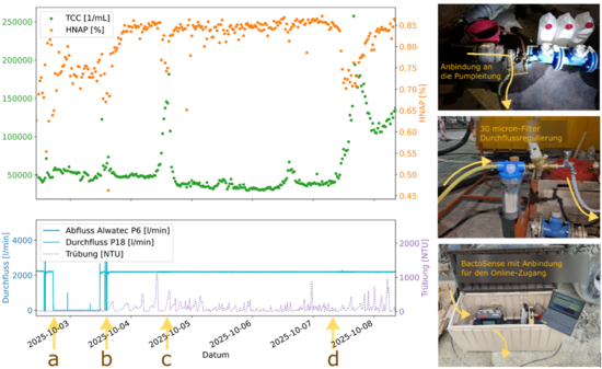 Abbildung: Links: Zeitlich aufgelöste Messresultate der 3. Messkampagne. Dargestellt sind totale Zellzahlen (TCC), grosse/gut markierbare Zellen (HNA), sowie Zeitreihen des Durchflusses und der Trübung in der Pumpleitung. Rechts: Aufbau und Anbindung der Messinstrumente.