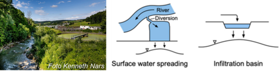 Abbildung: Links: Grundwasserregime und Zustrombereiche der Trinkwasserbrunnen im unteren Birstal zwischen Aesch und Reinach, Schweiz. Unten rechts: Querschnitt durch den Aquifer und Messsysteme zur Untersuchung der Fluss-Grundwasser Interaktion im Zustrom eines Trinkwasserbrunnens (Epting, J., Huggenberger, P., Radny, D., Hammes, F., Hollender, J., Page, R.M., Weber, S., Banninger, D. and Auckenthaler, A. (2018) Spatiotemporal scales of river-groundwater interaction - The role of local interaction processes and regional groundwater regimes. Science of the total Environment 618; https://doi.org/10.1016/j.scitotenv.2017.09.219).