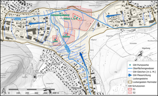 Grundwassermodelle stellen dabei ein wertvolles Hilfsmittel dar, um gestützt auf hydrologischen und hydrogeologischen Daten sowie Betriebsdaten, Anströmbereiche von Trinkwasserfassungen zu bestimmen bzw. abzuschätzen. Durch Szenarienentwicklung lassen sich mögliche Auswirkungen von Eingriffen oder Naturgefahren erfassen und entsprechende Gefahren- und Risikobeurteilungen durchführen.