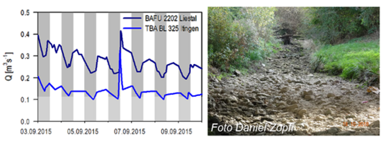 Abbildung 1: Oben: Grundwasserfliessregime Bereich Wüeri östlich von Sissach, einschliesslich Trinkwasserbrunnen und Grundwasserschutzzonen (BSc Hollinger 2024). Links unten: Einfluss des Pumpregimes (nachts: grau) von Trinkwasserbrunnen auf den Ergolzpegel. Rechts unten: Trockenfallen der Ergolz oberhalb von Sissach im Herbst 2018.