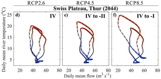 Finally, a classification of hysteresis loops revealed that global warming stretches most thermal hysteresis loops diagonally upwards to the left (Figure: Example BAFU measuring station Thur – 2044). This stretching trend results from the general decrease in runoff and the increased seasonal near-surface air temperature and water warming in the summer months; together, these two processes increase the water temperature of flowing waters even in summer.